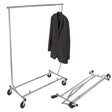 info@supremedisplay.com · (844) 229-5277 · (647) 729-8929A strong, reliable heavy‑duty salesman’s rack made from 1" round chrome tubing. A must have for trade shows, sidewalk sales and fitting rooms. A handy collapsible rack. It features a 48" hang rail with two 12" pull‑out rods for extra space, plus adjustable height settings at 55", 60", and 65". Smooth 4" ball‑bearing casters make it easy to move, while built‑in hang rail clips and protective rubber bumpers add convenience and durability. The rack collapses quickly for simple transport and storage.