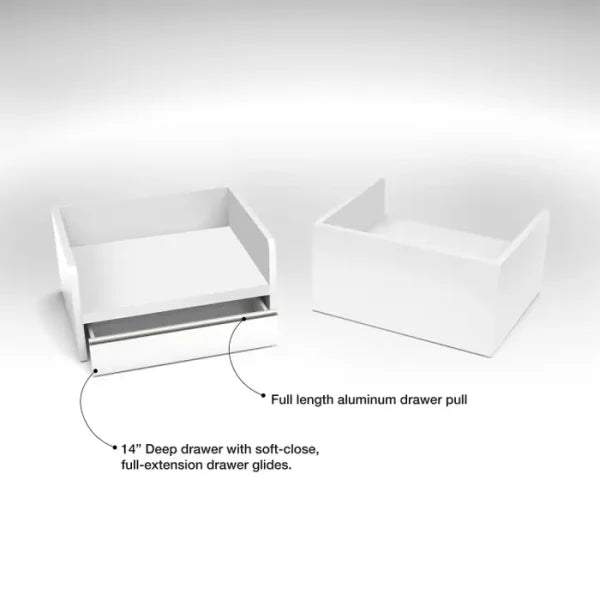 The well has a full width drawer that measures 24-7/16"W x 13-1/8"L x 3-3/5"H with full extension drawer slides allowing you to pull the drawer all the way out, without having to reach into the back of the drawer. The drawer has a soft-close feature to prevent slamming drawers. Includes a full drawer width aluminum drawer pull.